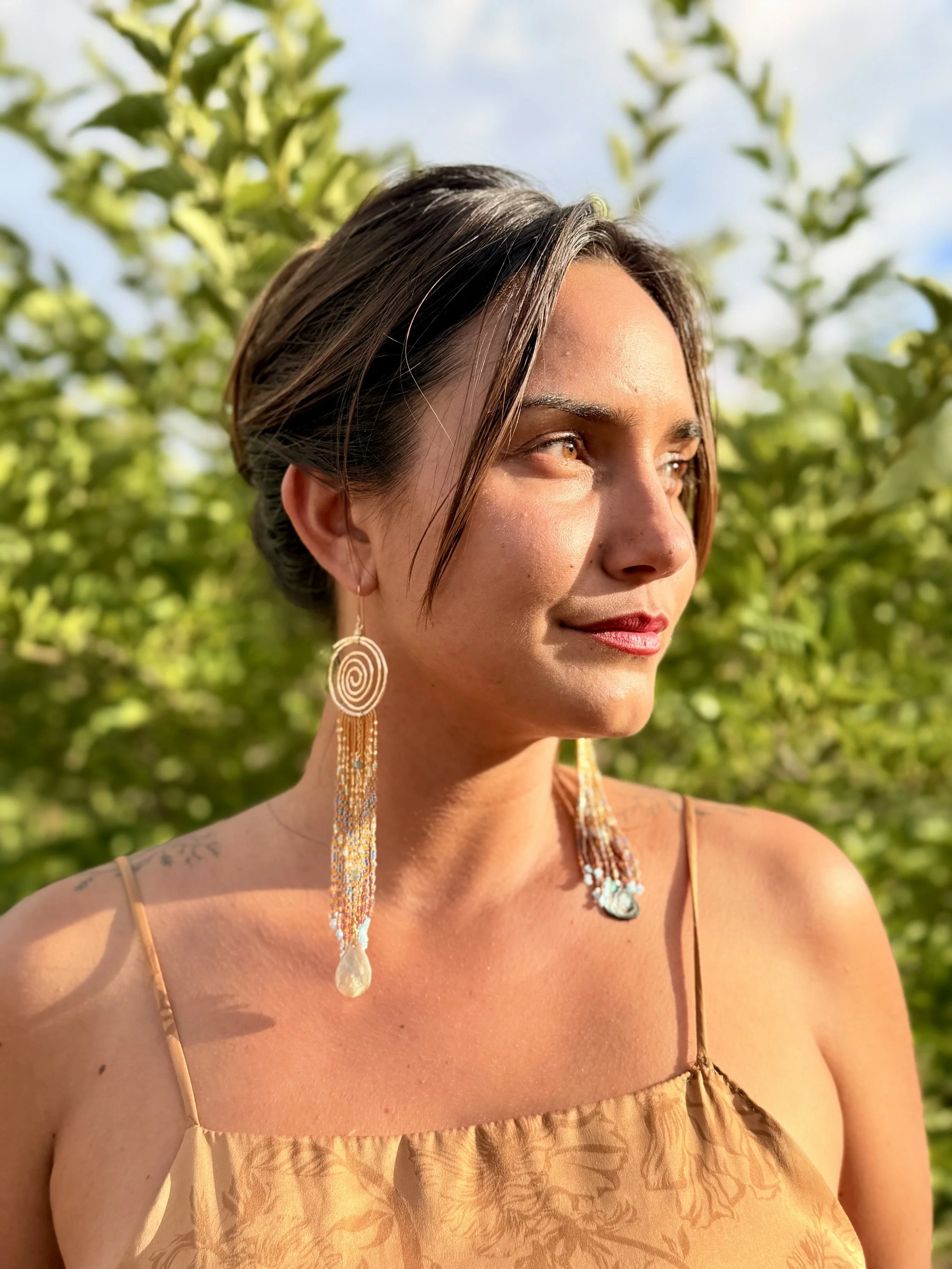 Although we have since parted ways, with some of us still on island and others scattered across the globe, Spiral Sister Designs lives on, centered now on California’s central coast and continuing to weave with kindred sisters here. We create everything by hand, the shells and seeds personally found and collected from across the Pacific. We find the raw materials, such as precious Abalone, on beach wanders, in between surf sessions, often alongside the youth we work with. We incorporate the foraged natural treasures across the Pacific into art and wearable nature altars to be worn and adored.